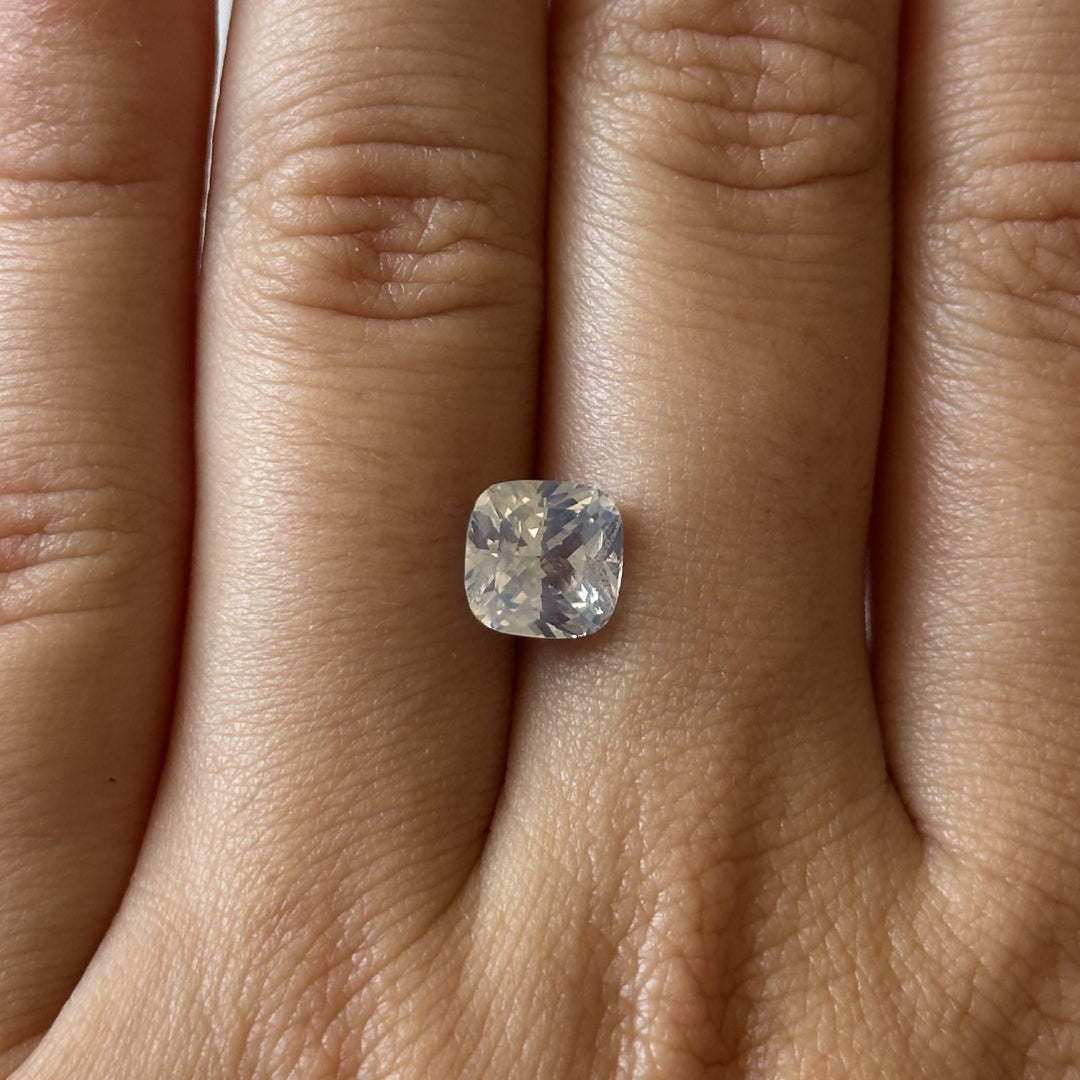 A truly rare, one-of-a-kind treasure, this 2.50ct Opalescent Sapphire is cut in a precision squared cushion mixed cut, revealing a luminous silver-white-blue body color. Ethically sourced from Ratnapura, Sri Lanka, the stone is entirely free from treatments.