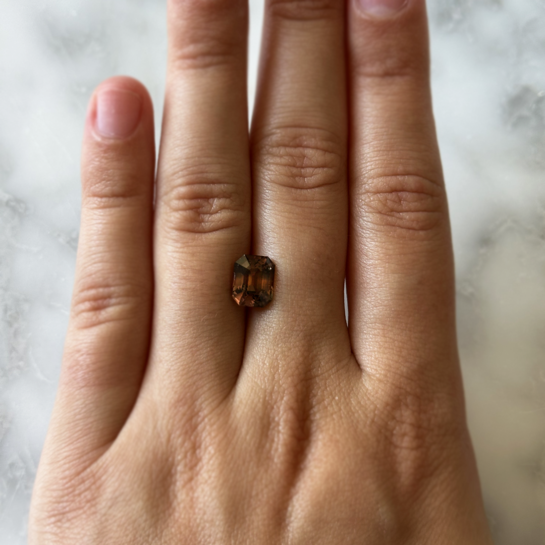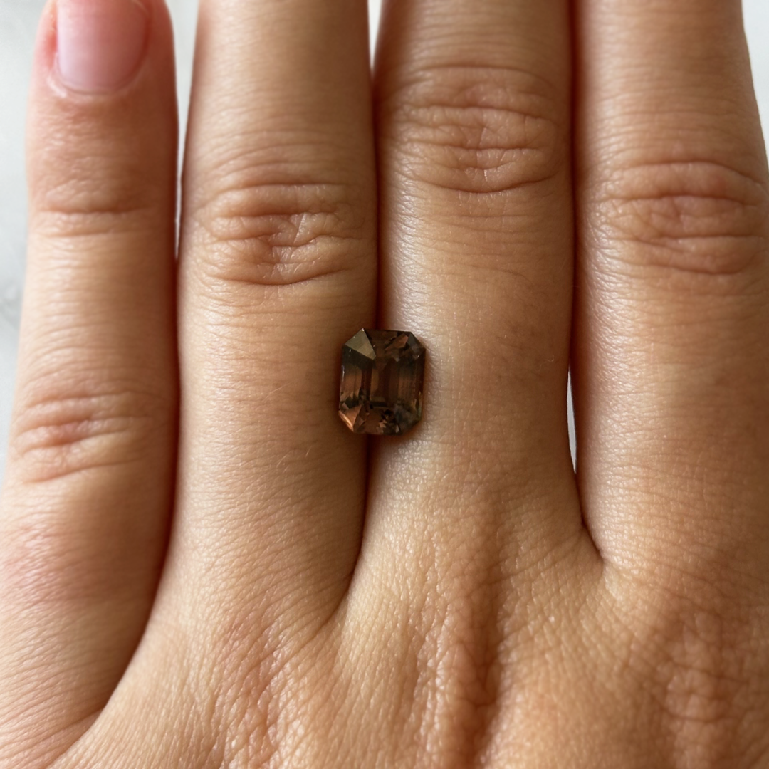 This extraordinary Bespoke 3.19ct Brown-Pink Sapphire is a rare color-change gem, shifting between soft brown and pink tones depending on the light. Expertly step cut, it displays clean facets that enhance the color and brilliance.