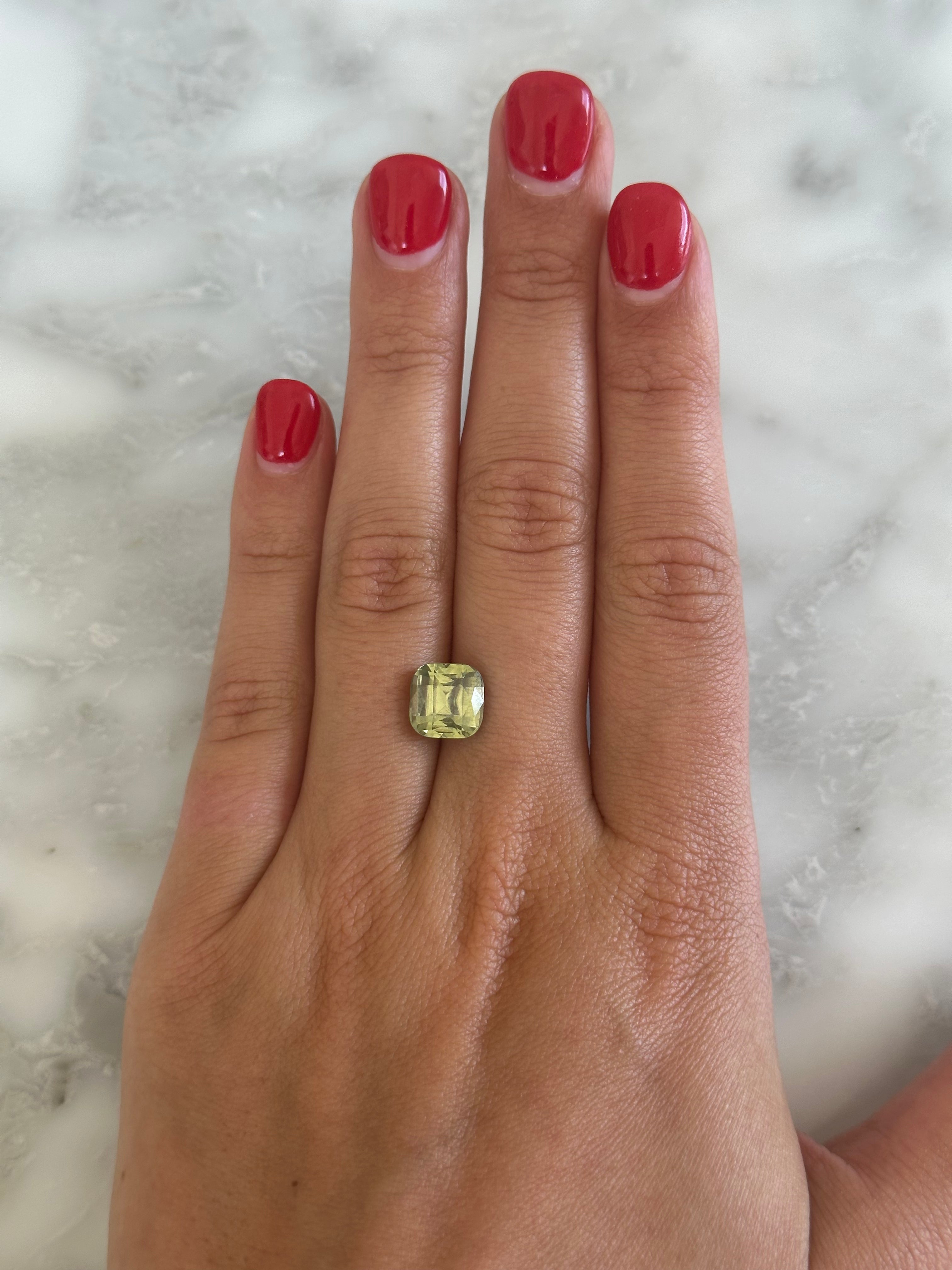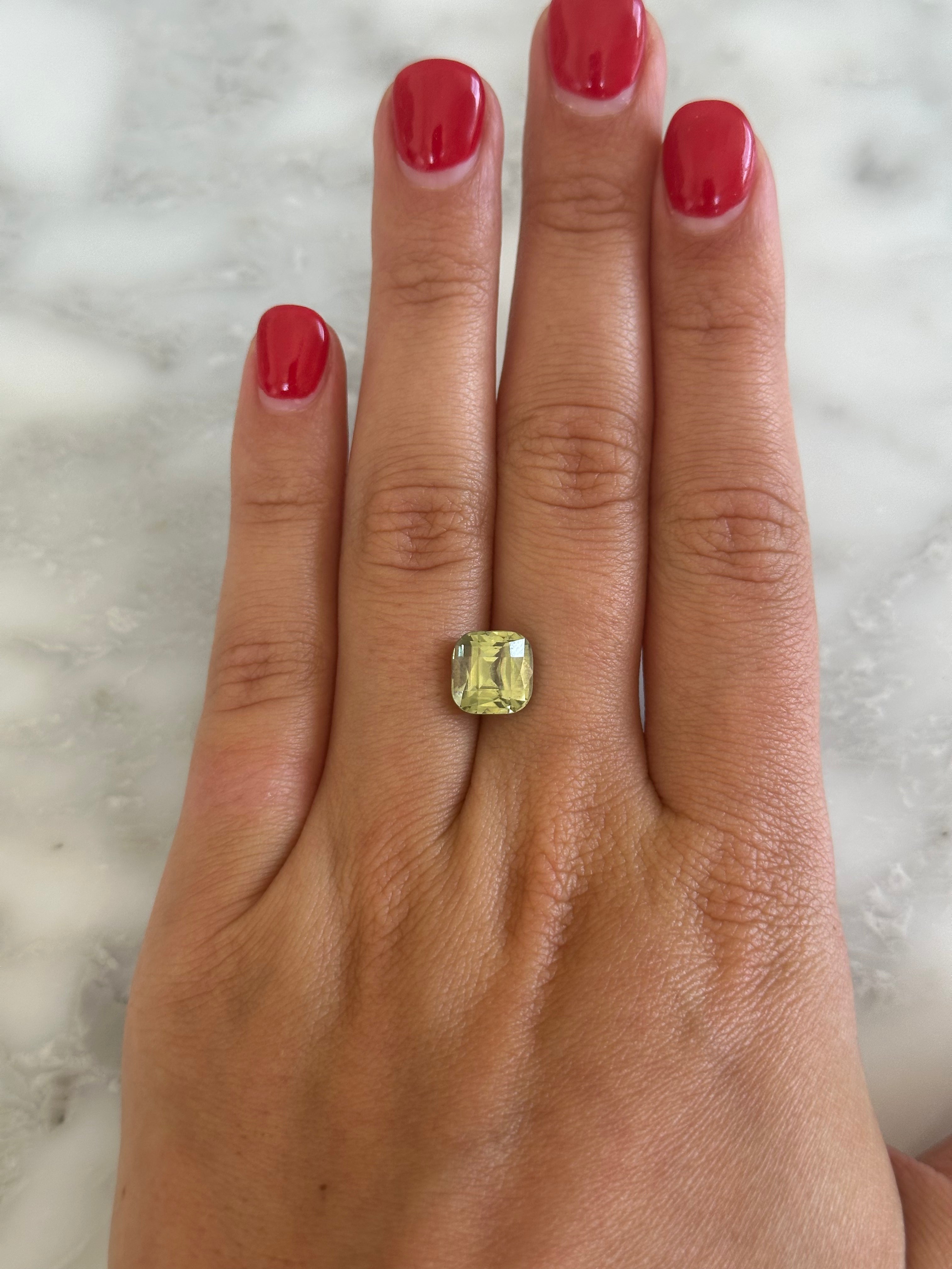 The Bespoke 4.68ct Green Zircon is a one-of-a-kind ring or charm, designed & handmade just for you in a setting, metal, and size of your choice. This stunning cushion cut stone features a light green hue that flashes yellows and deep greens in the light.