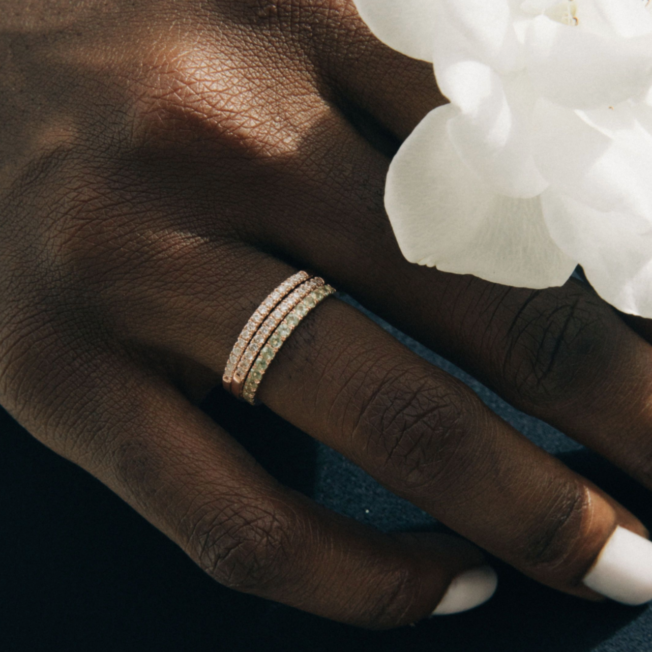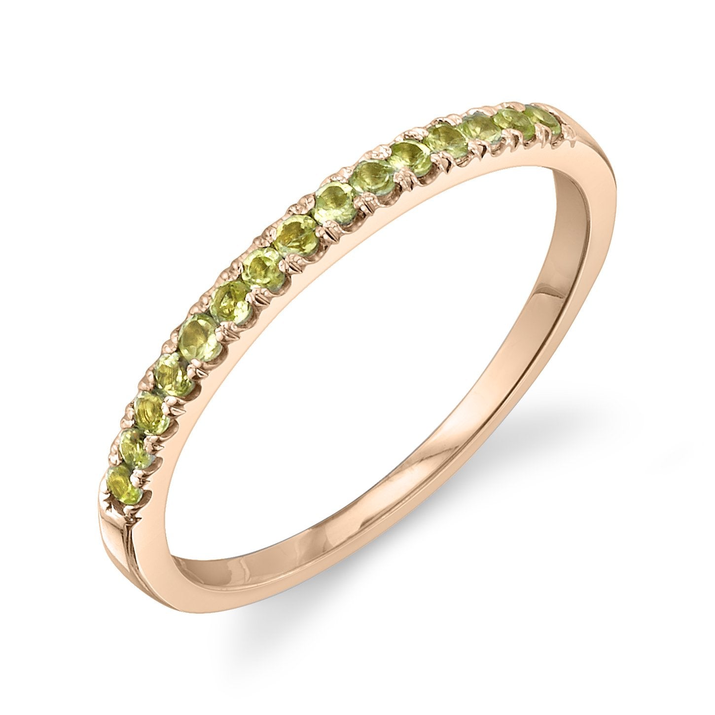 Peridot pavé ring perfect band for celebrating August birthdays every day. A gorgeous glowing lime green stone that is comfortable and durable for wearing alone or stacked with other beloved rings. Peridot is often given for 15th anniversaries and Egyptians called it “the gem of the sun.” Peridot crystals have been found in meteorites as old as 4.5 billion years—the age of Earth. Believed to protect one from night terrors and evil spirits.