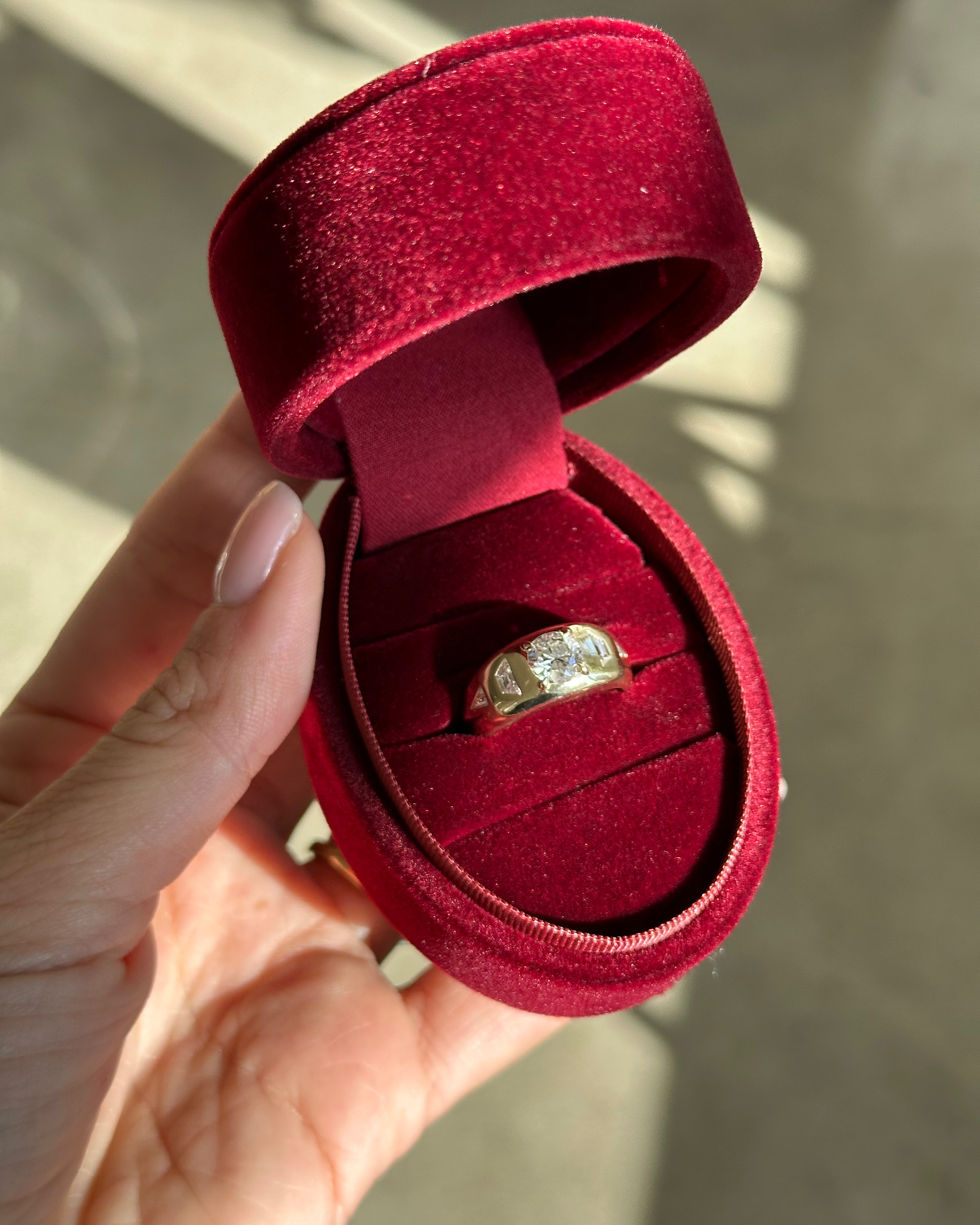 Lush burgundy velvet oval shaped box with velvet interior.